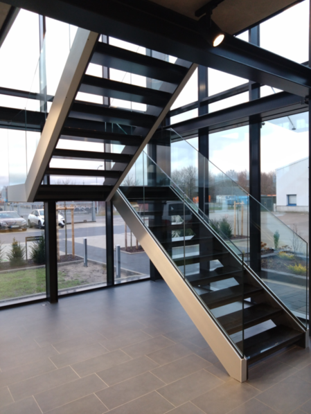 Stahlwangentreppen RAL mit Handlauf und satiniertes Glas